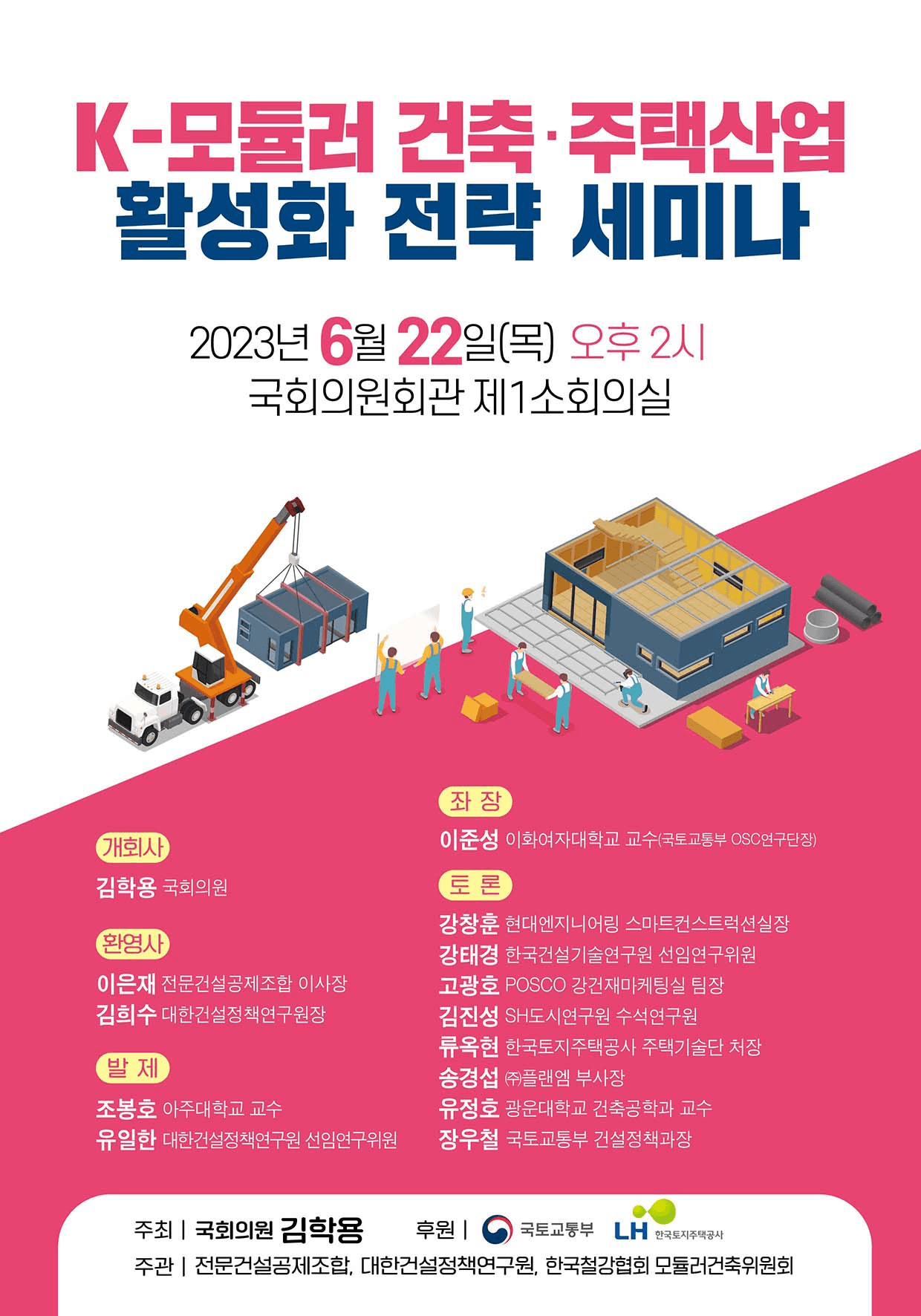 김학용 국회의원 주최, 전문건설공제조합, 대한건설정책연구원, 한국철강협회 모듈러건축위원회가 주관하는 ‘K-모듈러 건축·주택산업 활성화 전략 세미나’ 가 돌아오는 22일 국회의원회관에서 개최됩니다.
