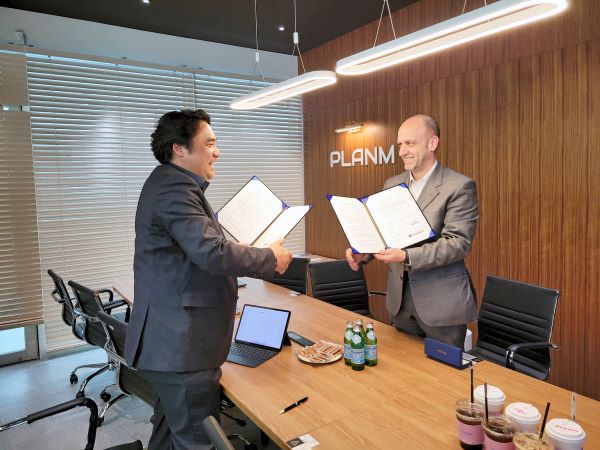 지난 14일 인천 송도 플랜엠 지사에서 이민규 플랜엠 대표(왼쪽)와 마커스 후버 브라이든 우드 디렉터가 업무협약을 체결하고 있다. 사진: 플랜엠 제공