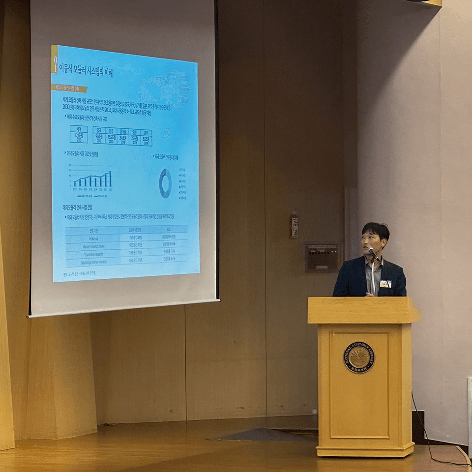 (주)플랜엠 송경섭 부사장은 ‘K-모듈러 진출방안’에 대한 발표를 통해 국내 모듈러 건축 시장 변화에 맞춰 이동식 모듈러의 필요성을 밝히며, 이동식 모듈러 시스템 핵심기술로 △STACKING △PRE-FAB △RE-USE 등을 강조했다.