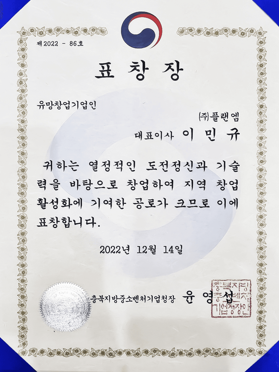 2022 충북중소기업인상 선정 유망 창업기업인, 플랜엠 선정