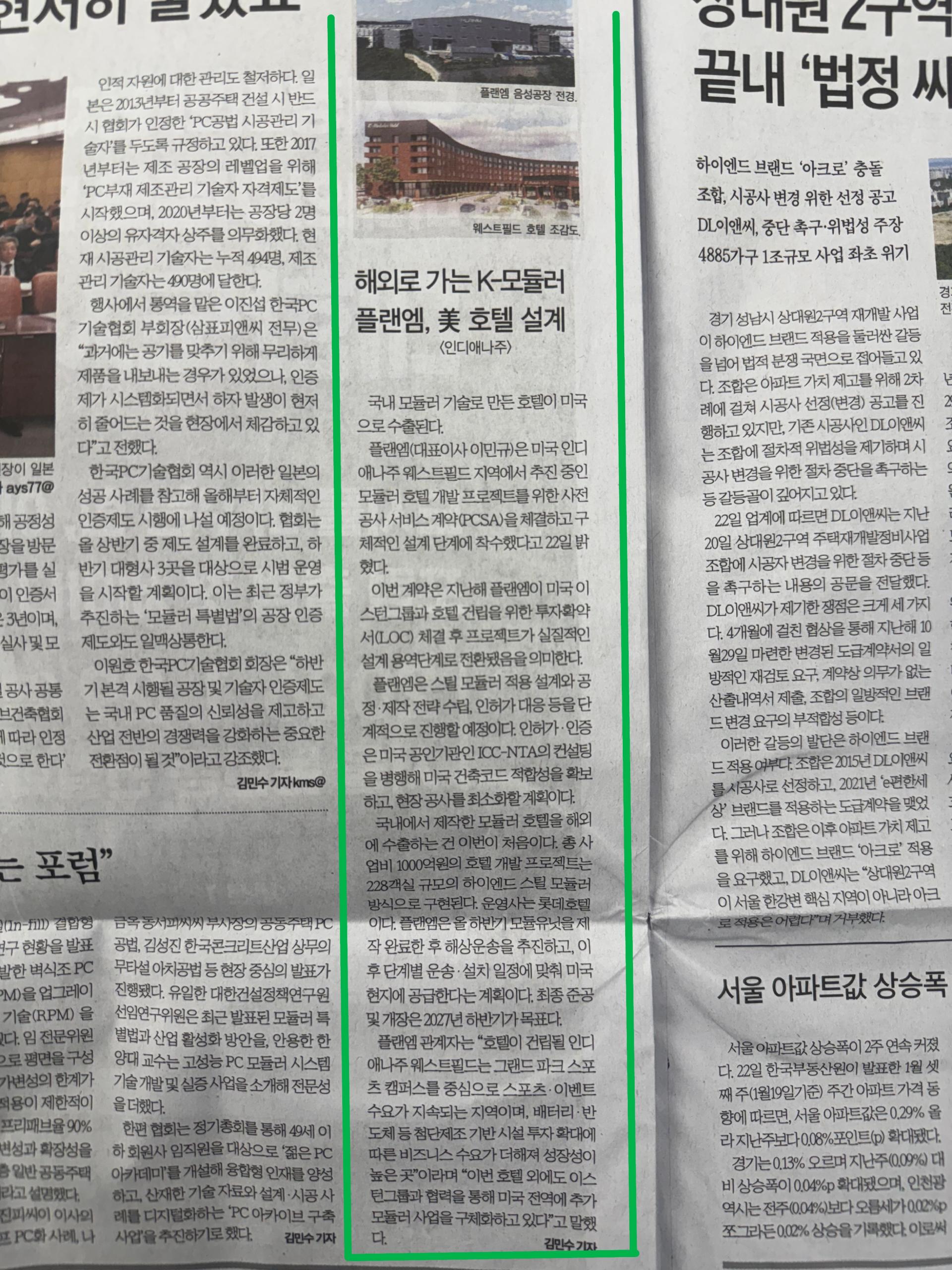 플랜엠, 국내 최초로 美에 ‘모듈러호텔’ 수출