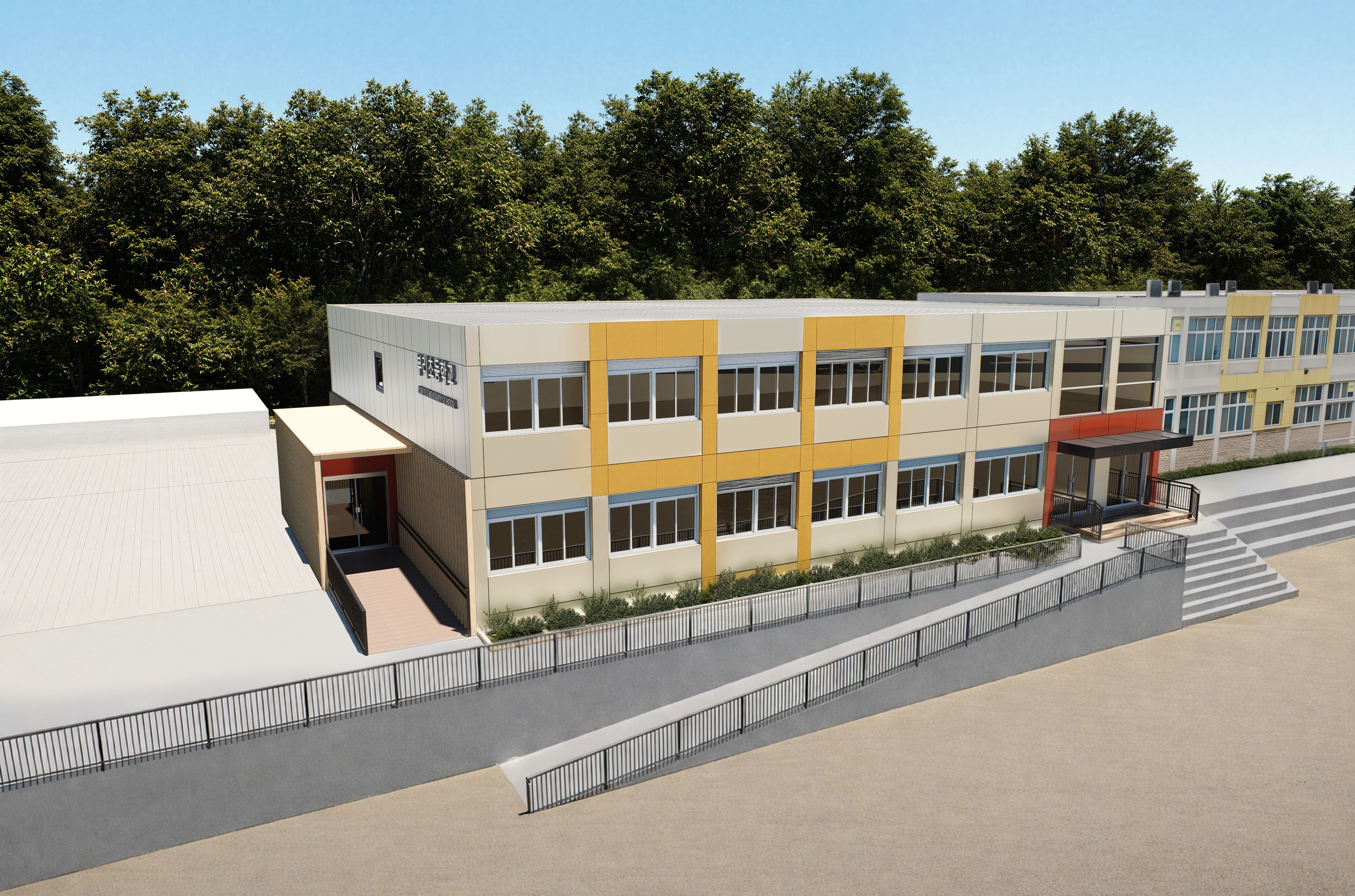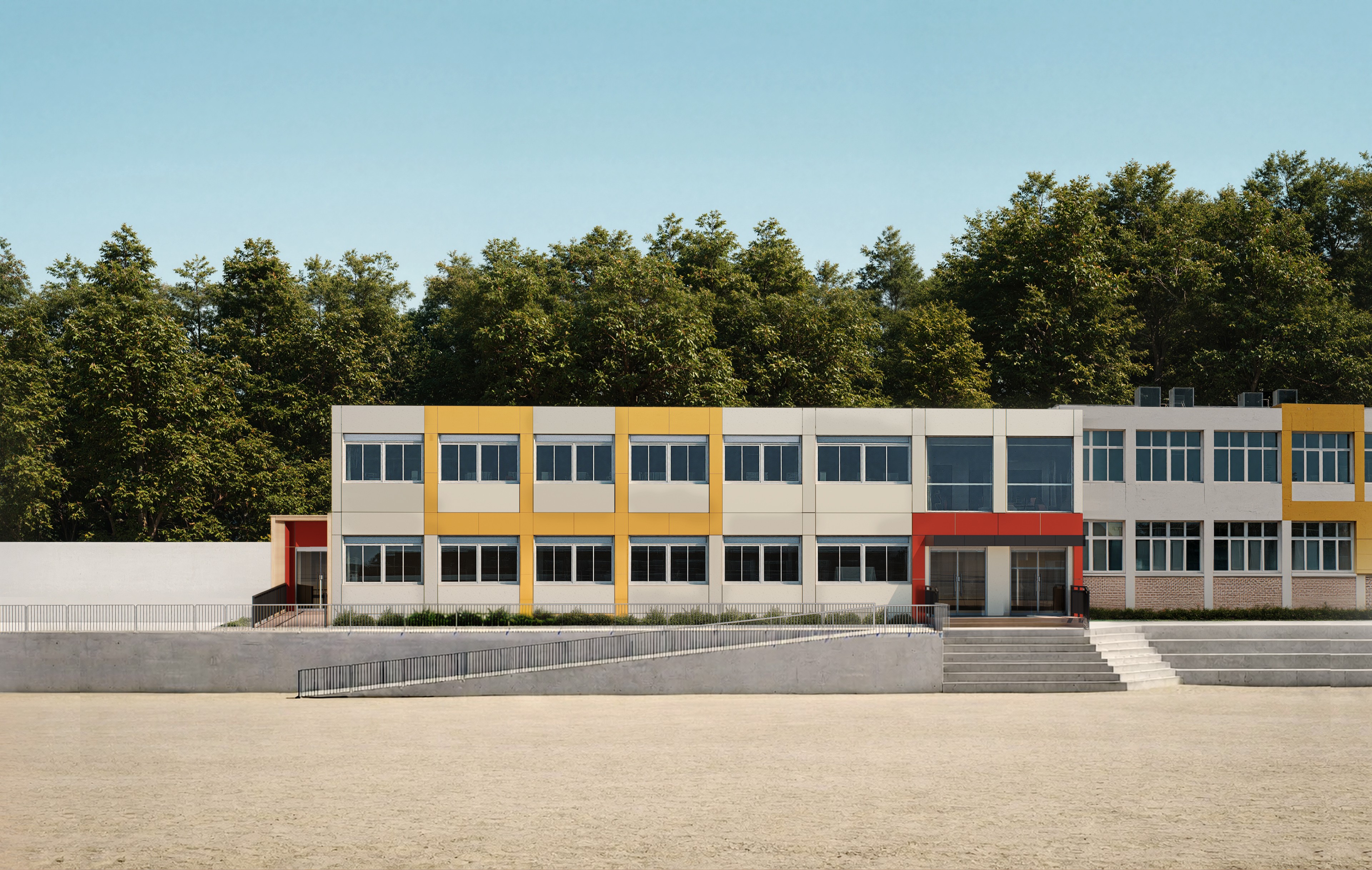 기존 건물의 상징적인 노란색과 빨간색을 포인트 컬러로 계승하여 학교의 아이덴티티를 유지함과 동시에, 신규 모듈러 입면과의 조화를 이끌어냈습니다.