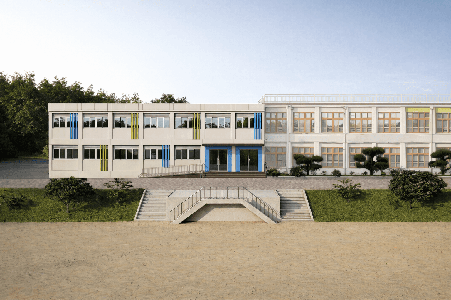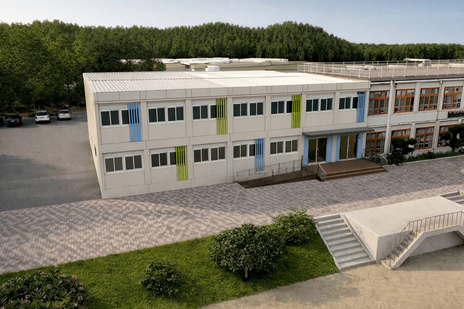 기존 본관의 상징색인 연두색과 파란색을 그대로 적용하여 시각적 이질감을 없애고, 학교의 고유한 아이덴티티를 유지했습니다.